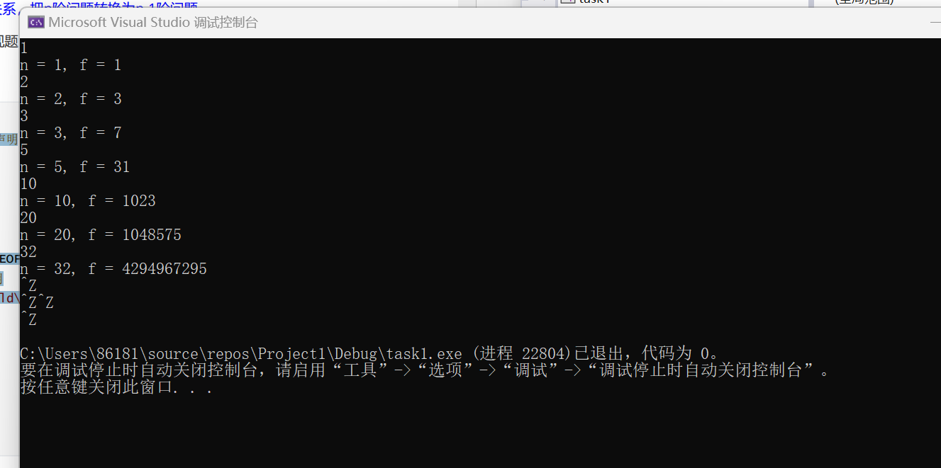 #include <stdio.h> long long func(int n); int main() { int n; long long f; while (scanf_s("%d", &n) != EOF) { f = func(n); printf("n = %d, f = %lld\n", n, f); } return 0; } long long func(int n) { double result; if (n == 1) result = 1; else result = 2 * func(n - 1) + 1; return result; }