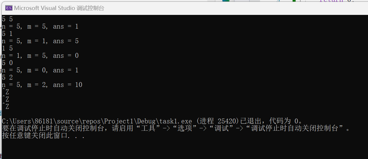 #include <stdio.h> int func(int n, int m); int main() { int n, m; while (scanf_s("%d%d", &n, &m) != EOF) printf("n = %d, m = %d, ans = %d\n", n, m, func(n, m)); return 0; } int func(int n, int m) { int result; if (n == m || m == 0) result = 1; else if (n < m) result = 0; else result = func(n - 1, m) + func(n - 1, m - 1); return result; }