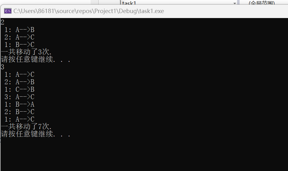 #include< stdio.h> #include<stdlib.h> #include<math.h> void hanoi(unsigned int n, char from, char temp, char to); void moveplate(unsigned int n, char from, char to); int main() { unsigned int n; int m; while (scanf_s(" %u", &n) != EOF) { hanoi(n, 'A', 'B', 'C'); m = pow(2, n) - 1; printf("一共移动了%d次.\n", m); system("pause"); } return 0; } void hanoi(unsigned int n, char from, char temp, char to) { if (n == 1) moveplate(n, from, to); else { hanoi(n - 1, from, to, temp); moveplate(n, from, to); hanoi(n - 1, temp, from, to); } } void moveplate(unsigned int n, char from, char to) { printf(" %u: %c-->%c\n", n, from, to); }