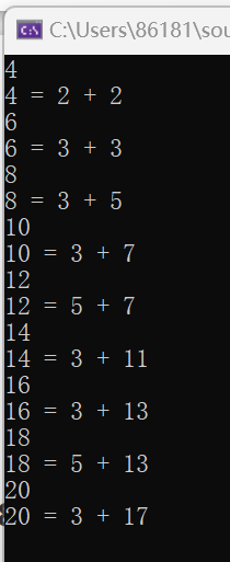 #include< stdio.h> #include<stdlib.h> #include<math.h> int is_prime(int n); int main() { int m; while (scanf_s("%d", &m) != EOF) is_prime(m); return 0; } int is_prime(int n) { int i, p_flag, q_flag,p,q; if ((n % 2 == 1) || n < 4) { printf("数据输入错误\n"); exit (0); } p = 1; do { p += 1; q = n - p; p_flag = 1; for (i = 2; i <= sqrt(1.0 * p); i++) { if (p % i == 0) { p_flag = 0; break; } } q_flag = 1; for (i = 2; i <= sqrt(1.0 * q); i++) { if (q % i == 0) { q_flag = 0; break; } } } while (p_flag * q_flag == 0); printf("%d = %d + %d", n, p, q); }