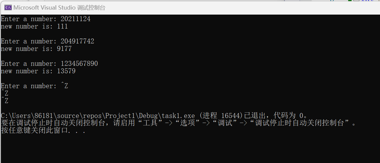 #include <stdio.h> long fun(long s); int main() { long s, t; printf("Enter a number: "); while (scanf_s("%ld", &s) != EOF) { t = fun(s); printf("new number is: %ld\n\n", t); printf("Enter a number: "); } return 0; } long fun(long s) { long n, result = 0; int m = 1; while (s > 0) { n = s % 10; if (n % 2 != 0) { result += n * m; m *= 10; } s = s / 10; } return result; }