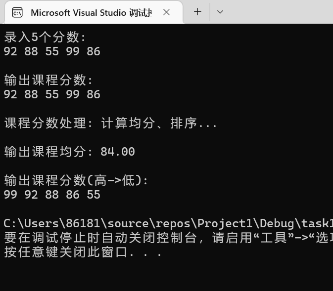#include <stdio.h> #define N 5 void input(int x[], int n); void output(int x[], int n); double average(int x[], int n); void bubble_sort(int x[], int n); int main() { int scores[N]; double ave; printf("录入%d个分数:\n", N); input(scores, N); printf("\n输出课程分数: \n"); output(scores, N); printf("\n课程分数处理: 计算均分、排序...\n"); ave = average(scores, N); bubble_sort(scores, N); printf("\n输出课程均分: %.2f\n", ave); printf("\n输出课程分数(高->低):\n"); output(scores, N); return 0; } void input(int x[], int n) { int i; for (i = 0; i < n; ++i) scanf_s("%d", &x[i]); } void output(int x[], int n) { int i; for (i = 0; i < n; ++i) printf("%d ", x[i]); printf("\n"); } double average(int x[], int n) { int j; double s = 0.0; double result; for (j = 0; j < n; j++) { s = s + x[j]; } result = s / (n * 1.0); return result; } void bubble_sort(int x[], int n) { int h, g,t; for (g = 0; g < n;g++) { for (h=0; h < n; h++) { if (x[h] < x[h + 1]) { t = x[h]; x[h] = x[h + 1]; x[h + 1] = t; } } } }