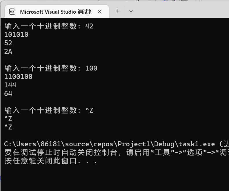 #include <stdio.h> #define N 100 void dec2n(int x, int n); int main() { int x; printf("输入一个十进制整数: "); while (scanf_s("%d", &x) != EOF) { dec2n(x, 2); dec2n(x, 8); dec2n(x, 16); printf("\n输入一个十进制整数: "); } return 0; } void dec2n(int x, int n) { int i,j=0; char y[16] = { '0','1','2','3','4','5','6','7','8','9','A','B','C','D','E','F' }; char k[16] ; while (x != 0) { i = x % n; x = x / n; k[j++] = y[i]; } while (j >= 0) printf("%c", k[--j]); printf("\n"); }