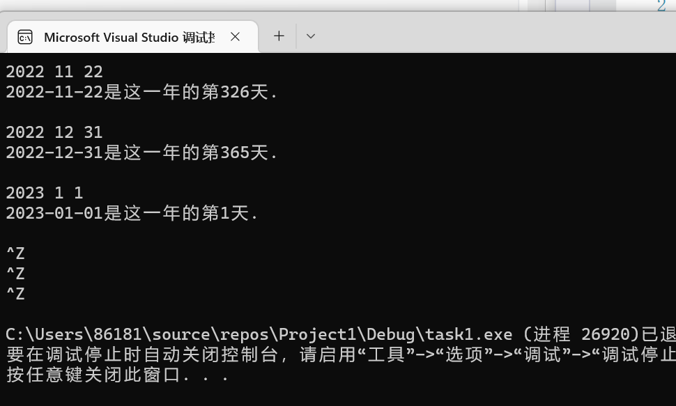 #include <stdio.h> #define N 13 int days_of_year(int year, int month, int day); int main() { int year, month, day; int days; while (scanf_s("%d%d%d", &year, &month, &day) != EOF) { days = days_of_year(year, month, day); printf("%4d-%02d-%02d是这一年的第%d天.\n\n", year, month, day, days); } return 0; } int days_of_year(int year, int month, int day) { int x[12] = { 31,0,31,30,31,30,31,31,30,31,30,31 }; int leapyear; leapyear = year % 4 == 0 && year % 100 != 0 || year % 400 == 0; x[1] = 28 + leapyear; int s = 0, i; for (i = 0; i < month - 1; i++) { s = s + x[i]; } return s + day; }