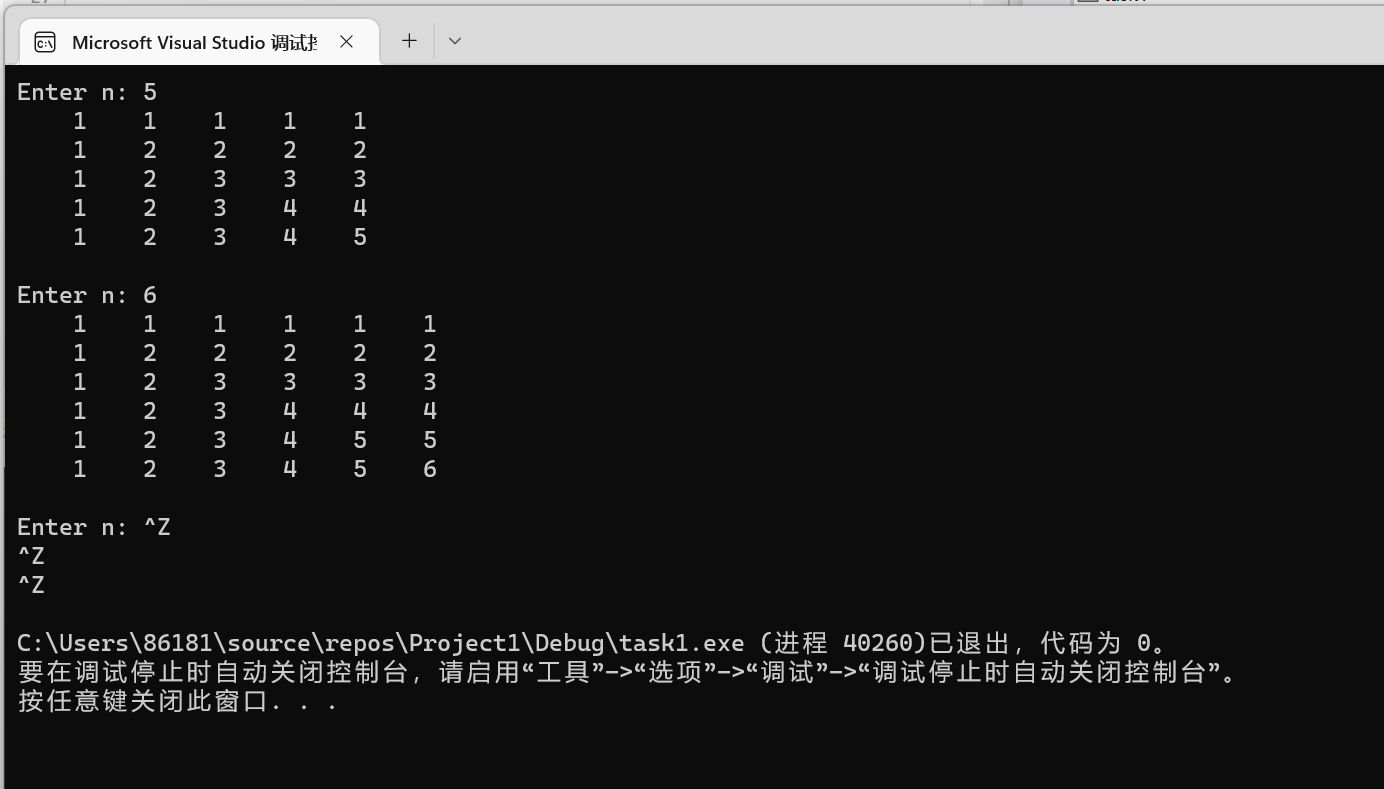 #include <stdio.h> #define N 100 void func(int x[][N], int n); void output(int x[][N], int n); int main(){ int x[N][N]; int i, j, n; printf("Enter n: "); while (scanf_s("%d", &n) != EOF) { func(x, n); output(x, n); printf("\nEnter n: "); } return 0; } void output(int x[][N], int n) { int i, j; for (i = 0; i < n; ++i) { for (j = 0; j < n; ++j) printf("%5d", x[i][j]); printf("\n"); } } void func(int x[][N], int n) { int i, j; for (i = 0; i < n; i++) for (j = 0; j < n; j++) if (i <= j) x[i][j] = i+1; else x[i][j] = j+1; }