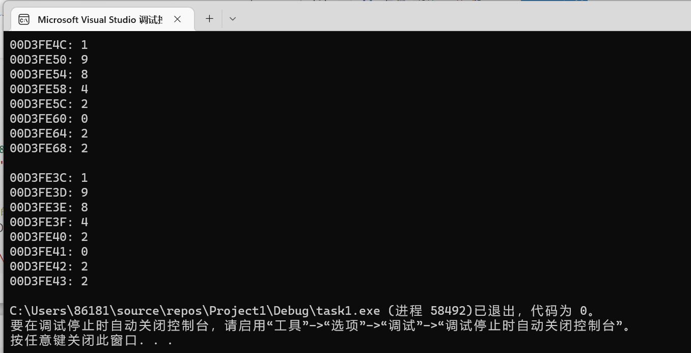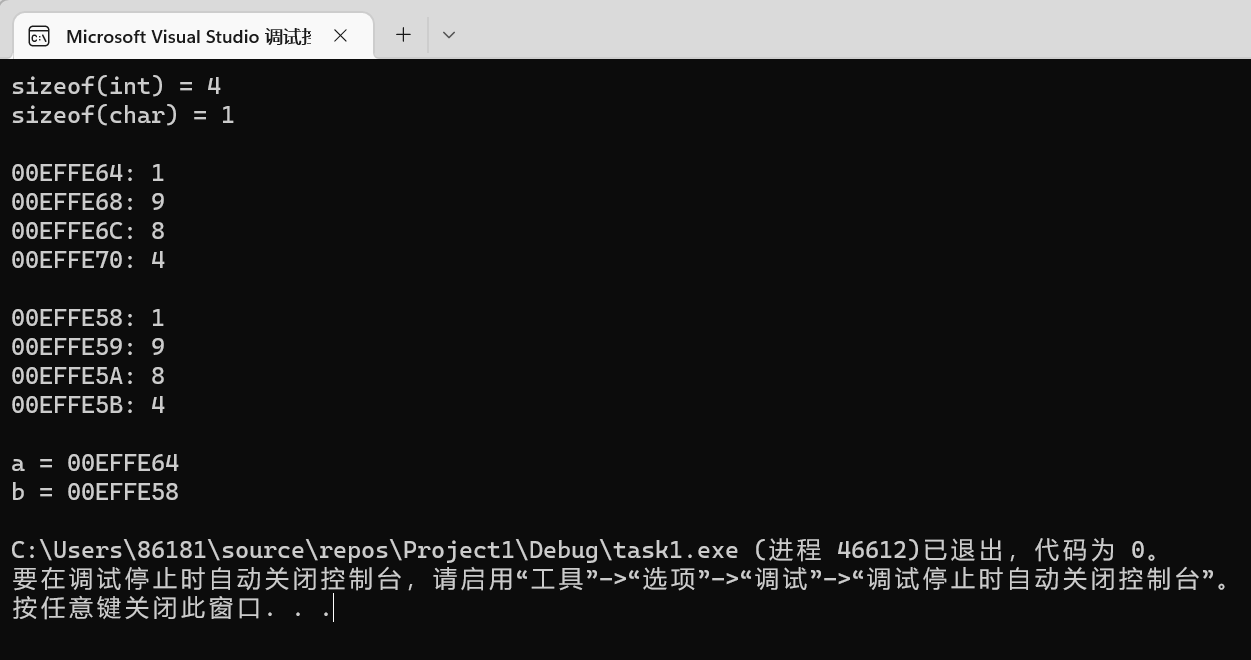 #include <stdio.h> #define N 4 int main() { int a[N] = { 1, 9, 8, 4 }; char b[N] = { '1', '9', '8', '4' }; int i; printf("sizeof(int) = %d\n", sizeof(int)); printf("sizeof(char) = %d\n", sizeof(char)); printf("\n"); for (i = 0; i < N; ++i) printf("%p: %d\n", &a[i], a[i]); printf("\n"); for (i = 0; i < N; ++i) printf("%p: %c\n", &b[i], b[i]); printf("\n"); printf("a = %p\n", a); printf("b = %p\n", b); return 0; }