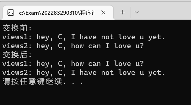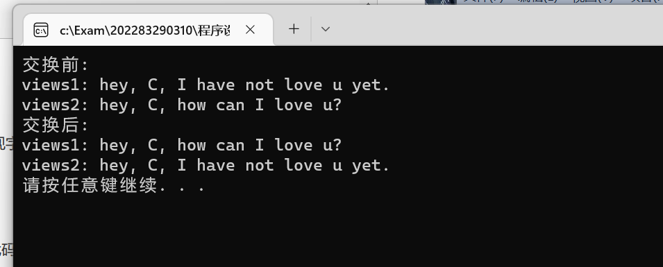 #include <stdio.h> #include <string.h> #include <stdlib.h> #define N 80 int main() { char views[2][N] = {"hey, C, I have not love u yet.","hey, C, how can I love u?"}; char t[N]; printf("交换前: \n"); printf("views1: %s\n", views[0]); printf("views2: %s\n", views[1]); strcpy(t, views[0]); strcpy(views[0], views[1]); strcpy(views[1], t); printf("交换后: \n"); printf("views1: %s\n", views[0]); printf("views2: %s\n", views[1]); system("pause"); return 0; }