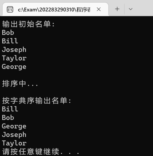 #include <stdio.h> #include <string.h> #include <stdlib.h> #define N 5 #define M 20 void bubble_sort(char str[][M], int n); int main() { char name[][M] = { "Bob", "Bill", "Joseph", "Taylor", "George" }; int i; printf("输出初始名单:\n"); for (i = 0; i < N; i++) printf("%s\n", name[i]); printf("\n排序中...\n"); bubble_sort(name, N); printf("\n按字典序输出名单:\n"); for (i = 0; i < N; i++) printf("%s\n", name[i]); system("pause"); return 0; } void bubble_sort(char str[][M], int n) { int t=1; while (t==1) { int i; char x[M]; for (i = 0; i < N-1; i++) { if (strcmp(str[i], str[i + 1]) < 0) t = 0; else { strcpy(x, str[i]); strcpy(str[i], str[i+1]); strcpy(str[i+1],x); t = 1; } } } }