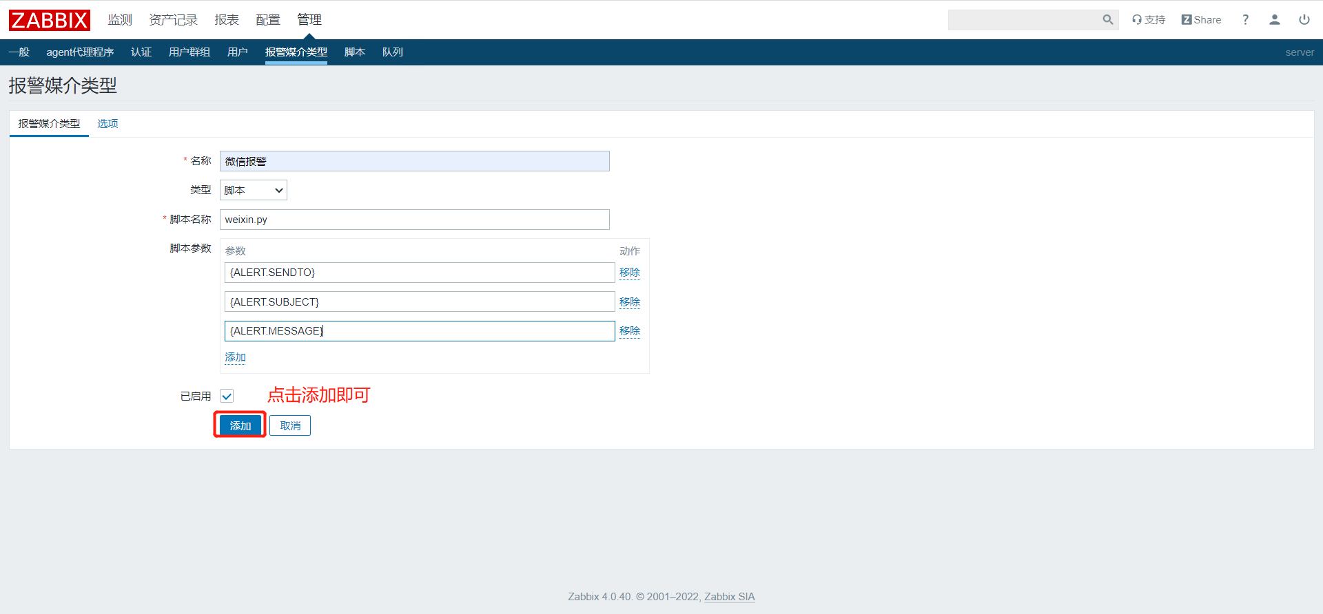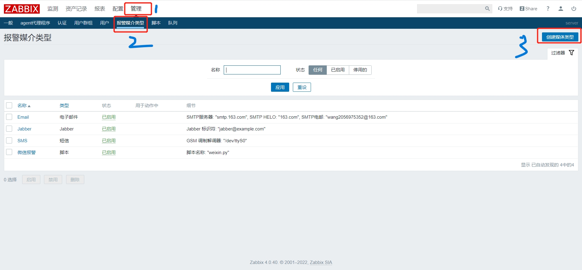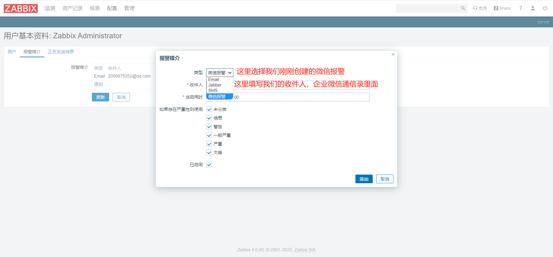 注:这里的类型是刚刚创建的报警媒介类型的名称