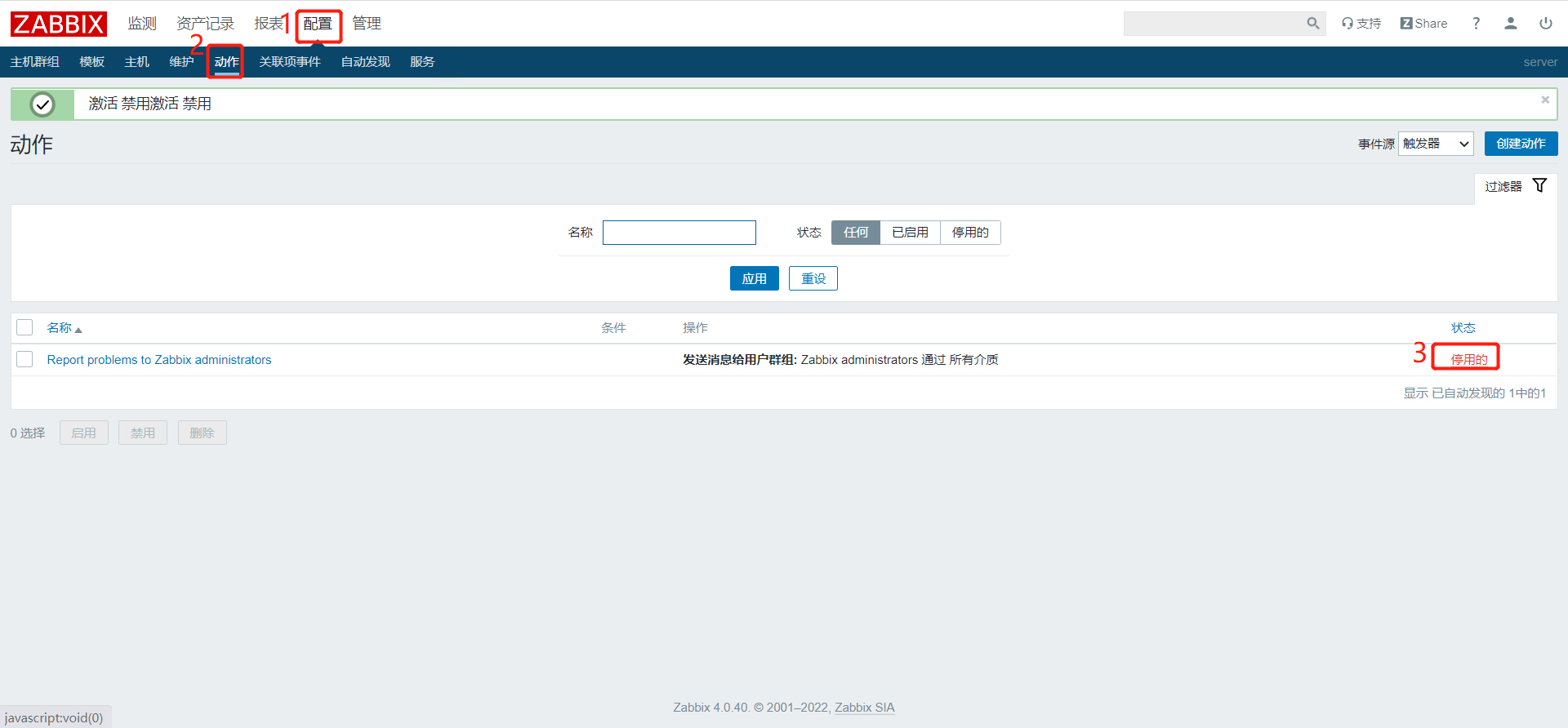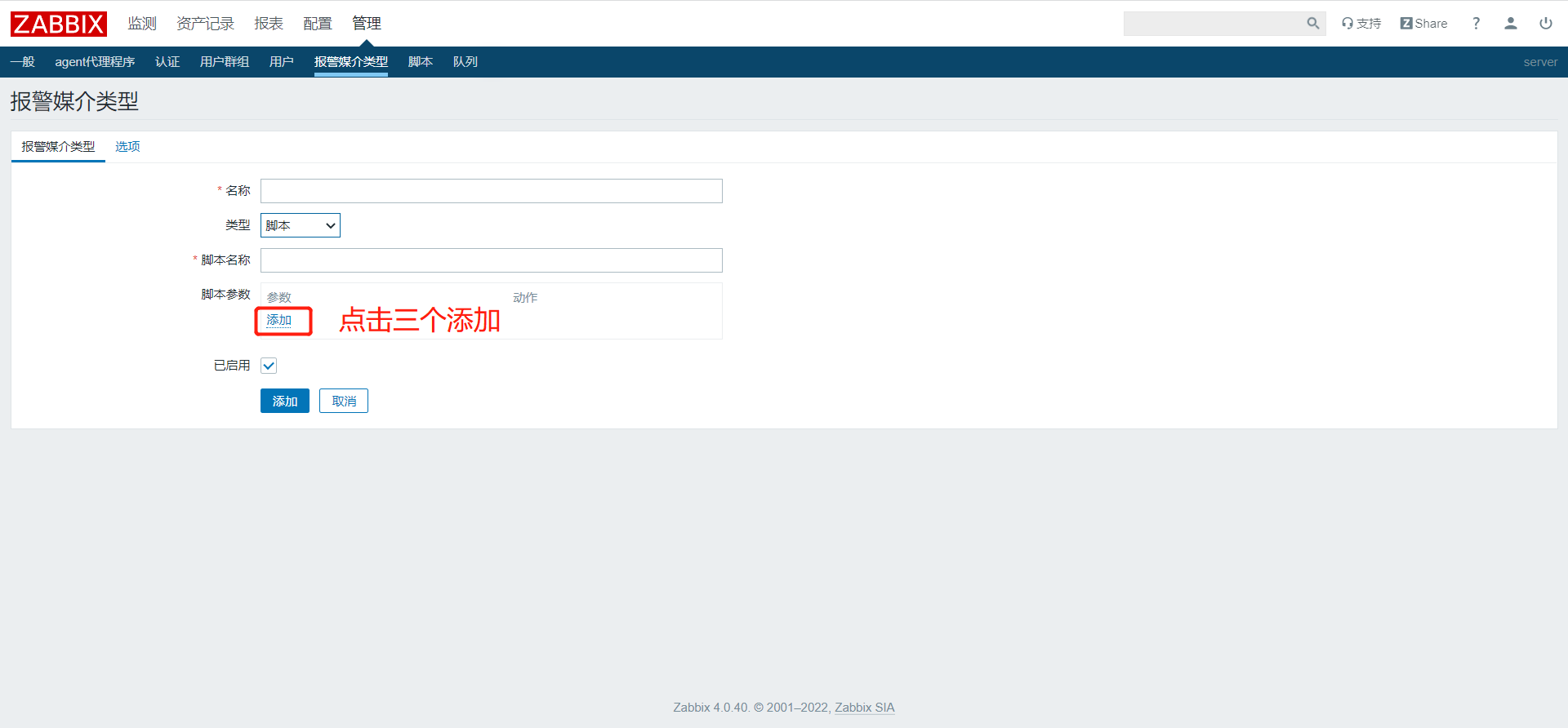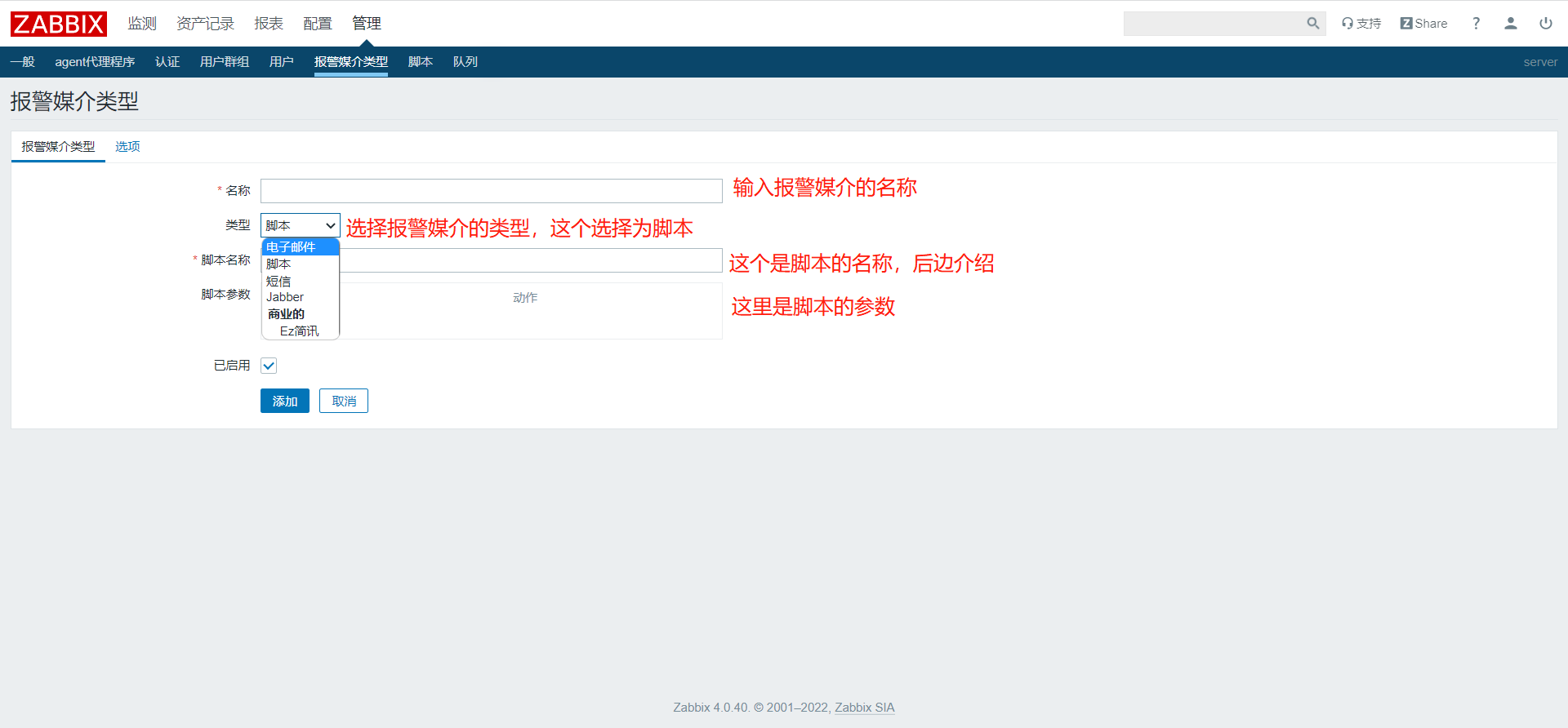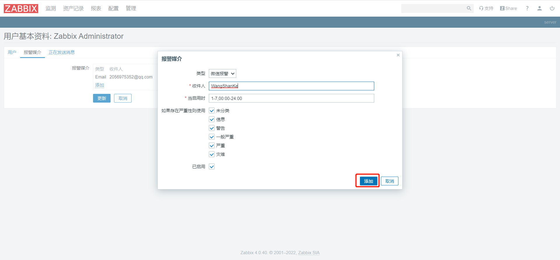 注:这里的类型是刚刚创建的报警媒介类型的名称
