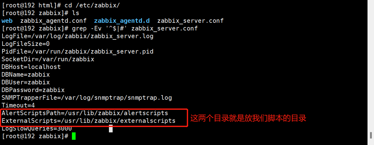 grep -Ev '^$|#' zabbix_server.conf # 我当前是在/etc/zabbix/的目录下面,在/etc/zabbix/下面才可以直接运行,不然需要用绝对路径