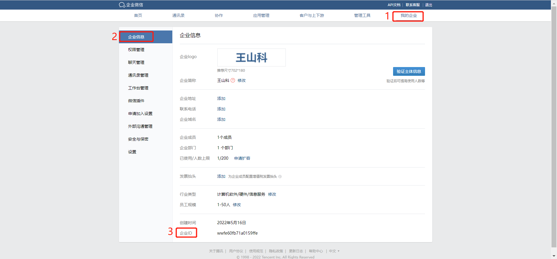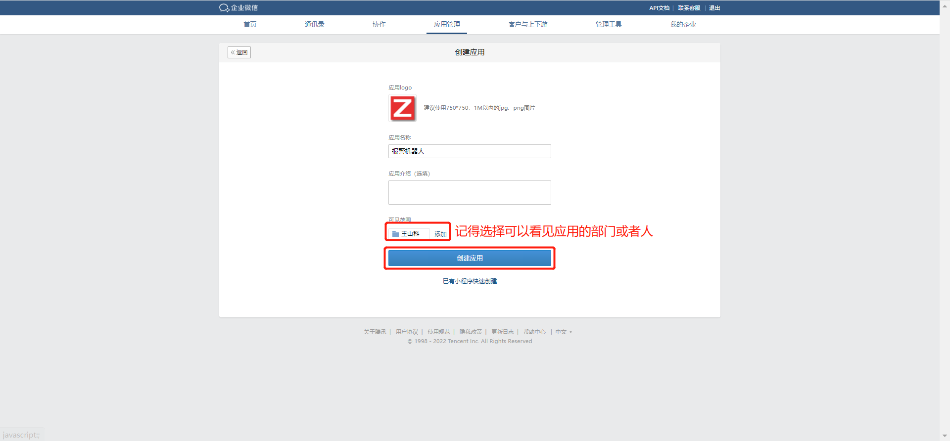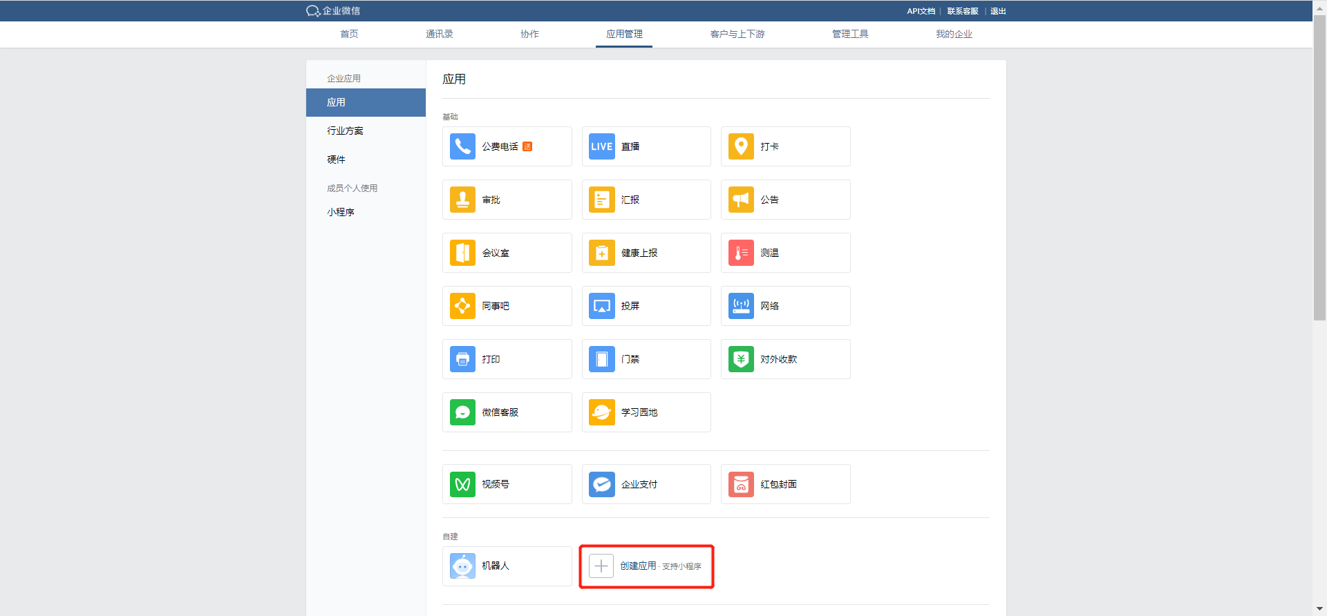 2.创建应用,创建应用是为了有人给我们报警,还有获取应用id和secret(现在secret只能通过手机版企业微信获得,还是乖乖下载企业微信吧)