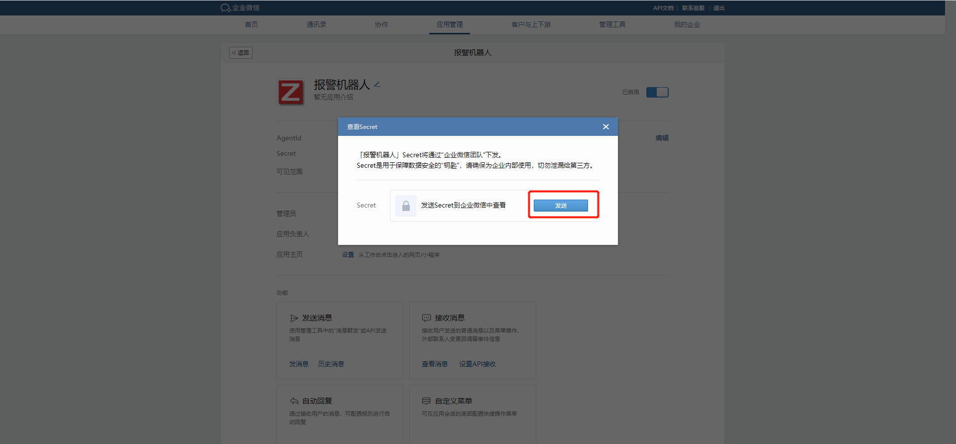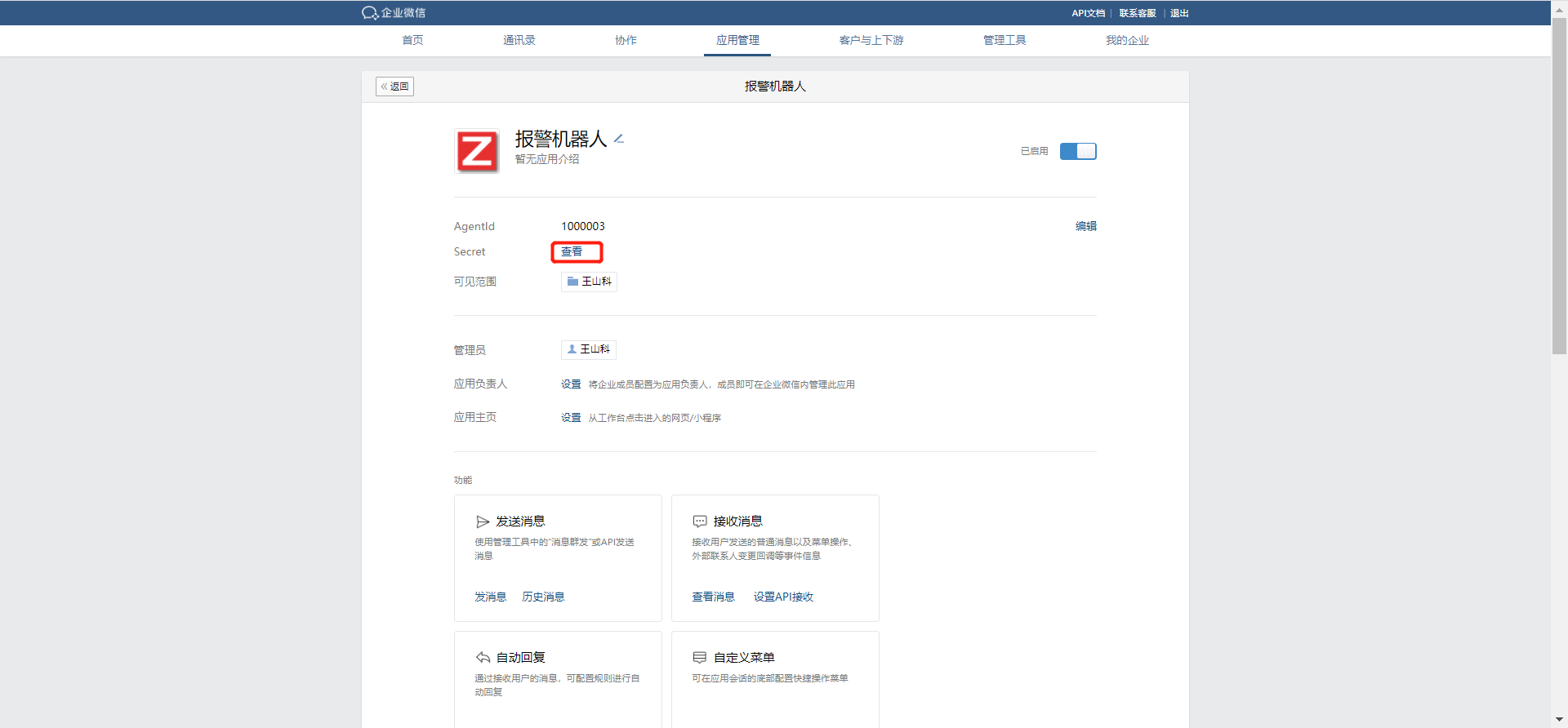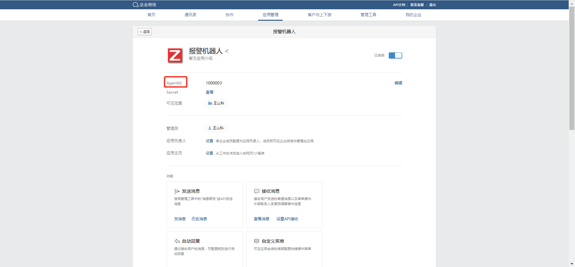 3.获取应用的agentid,记得把weixin.py脚本里面的agentid替换了