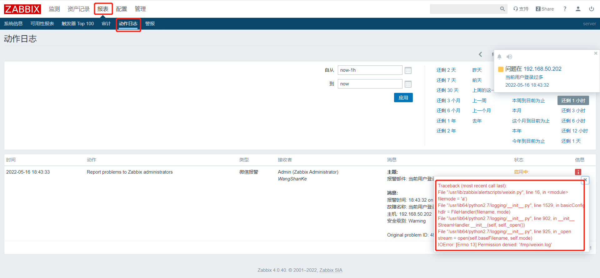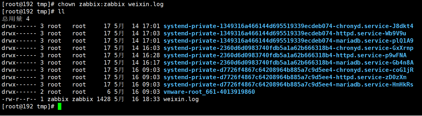 这个报错是因为zabbix写日志的时候没有权限向/tmp/weixin.log 里面写入,重新删除或者改变用户都行