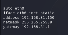 # 可以选择桥接或者net模式,我用的是桥接的模式,如果是桥接模式,先查看自己物理机的ip地址,kali同网段即可 vi /etc/network/interface auto eth0 iface eth0 inet static address 192.168.31.150 netmask 255.255.255.0 gateway 192.168.31.1 # 这是我的ip配置,改成你的网段即可