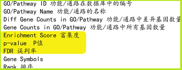 表头各个参数的解释如下,其中,重点看三个指标, enrichment score、p值和FDR。Pathway分析主要看P值和FDR值,两者越小越好。GO分析还可看enrichment score,数值越大表示某个GO term越容易受到实验因素的影响。