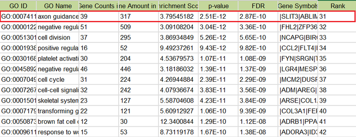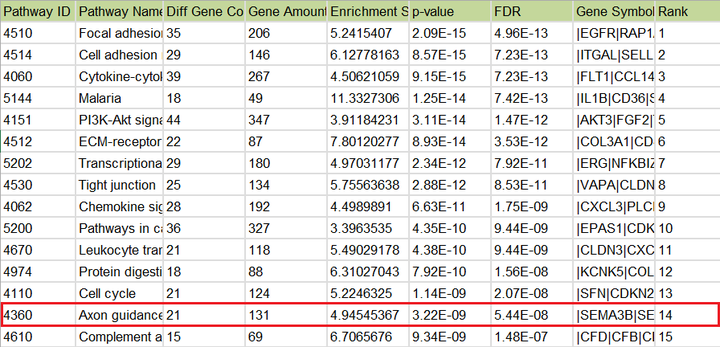 GO和pathway分析结果中都得到了文章中选定的axon guidance这个结果(红框)。