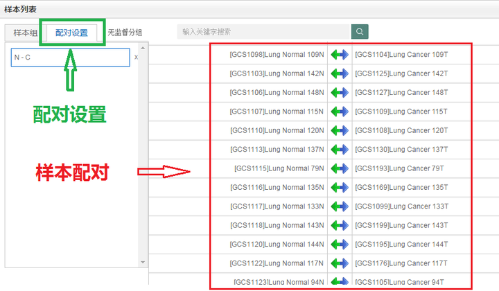 样本数据GSE19804直接来自于GCBI样本库,将样本发送到在线实验室。点击方案中样本模块,在样本分组管理中选择配对样本,选择好相应的对照组和实验组样。Lung normal **N为对照组,Lung cancer **T为实验组。