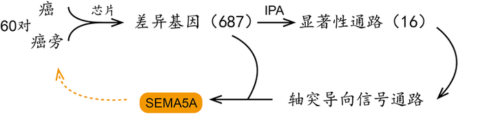 因此我们需要判断差异基因在肺癌细胞中主要富集在哪些功能类群和代谢通路。文章作者利用IPA(Ingenuity Pathway Analysis)软件对差异基因进行了功能分析,筛选出了16条显著性代谢通路3。在最显著改变的三条通路中,其中两条都和轴突导向信号通路(axon guidance)相关,作者很意外,于是就选定了轴突导向信号通路,并在其中挑选了差异表达倍数最高的SEMA5A基因作为后续的研究对象。