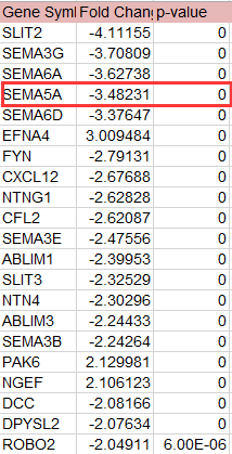 将axon guidance中的差异表达基因全部挑选出来,列表如下。作者在文中挑选了显著性最高的SEMA5A作为后续的研究对象。在我们的分析中,当p值小于10^-6时默认为0,按照表达倍数排列SEMA5A也排在前列,和作者的结果较吻合。