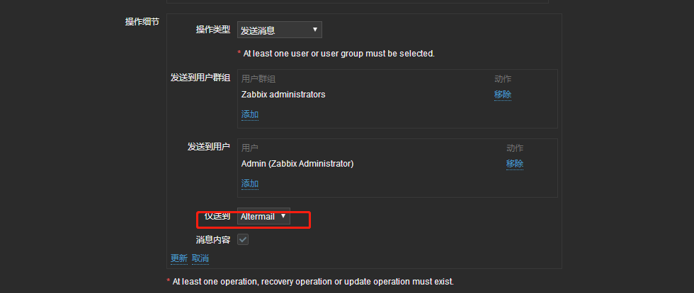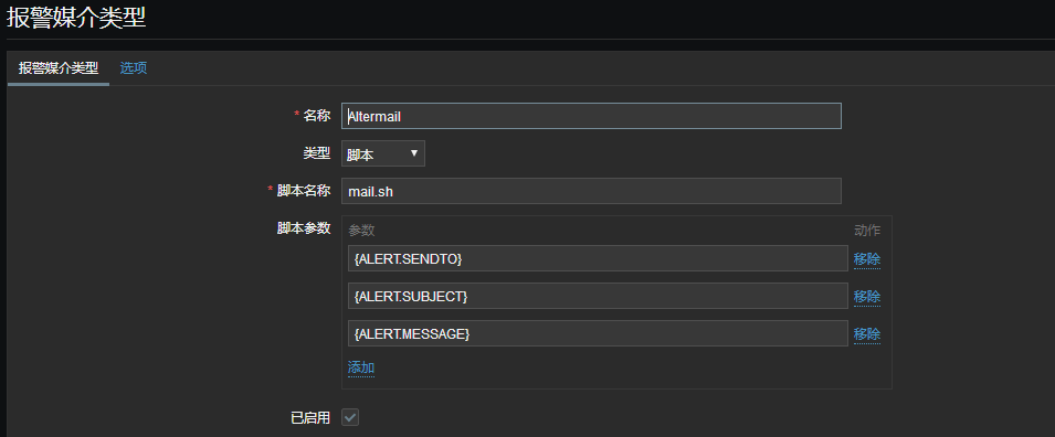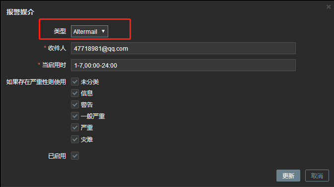 管理-->用户-->Admin-->报警媒介-->添加