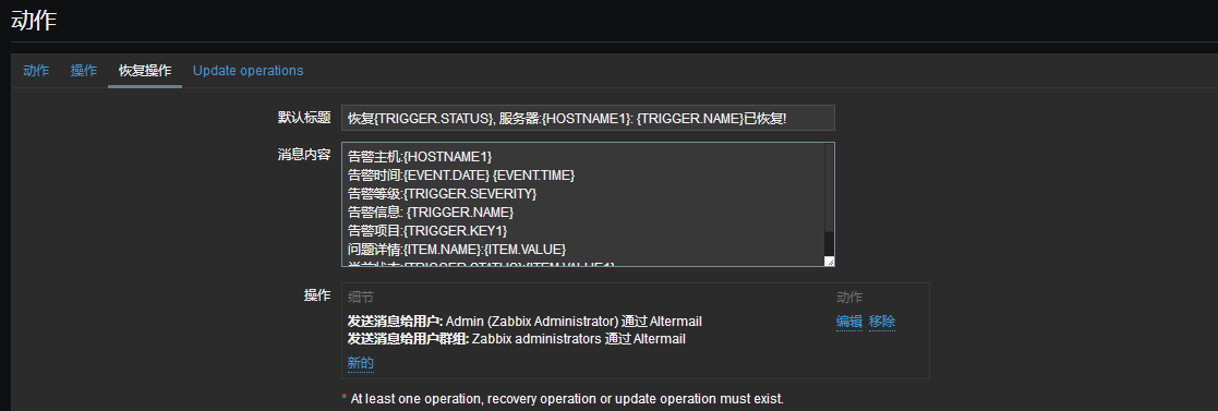 恢复{TRIGGER.STATUS}, 服务器:{HOSTNAME1}: {TRIGGER.NAME}已恢复!