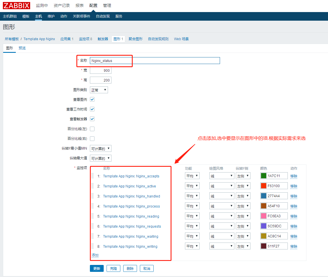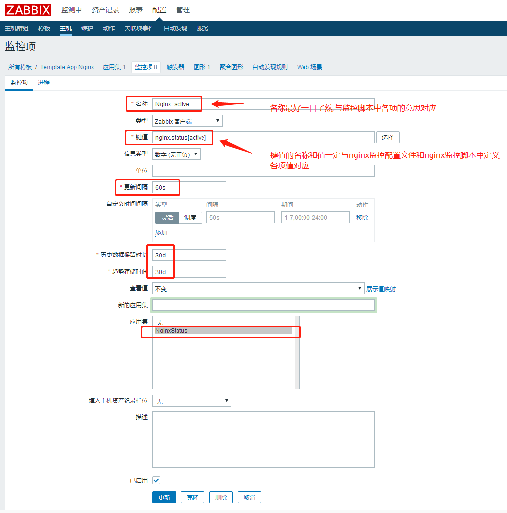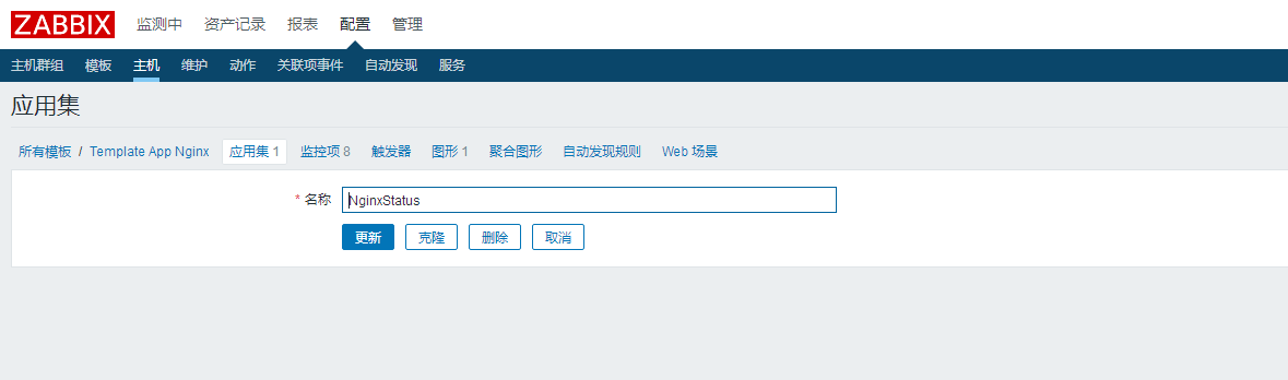 创建监控模板(Template App Nginx)-->创建应用集(NginxStatus)-->创建监控项(脚本中的8个)-->创建图形