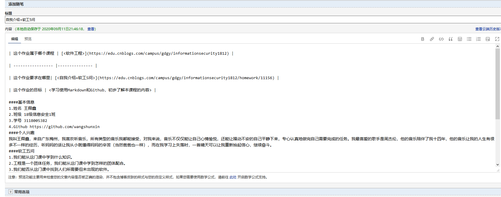 | 这个作业要求在哪里| <自我介绍+软工5问> |