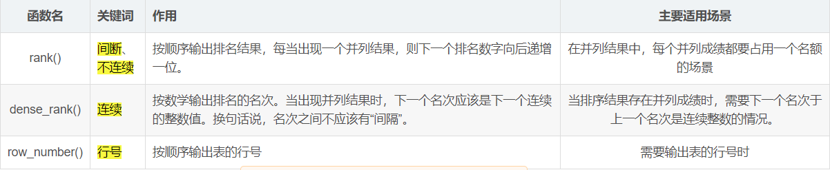 dense 英语中指“稠密的、密集的”。dense_rank()是的排序数字是连续的、不间断。当有相同的分数时,它们的排名结果是并列的,例如,1、2、2、3、4。