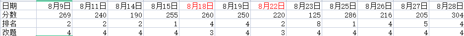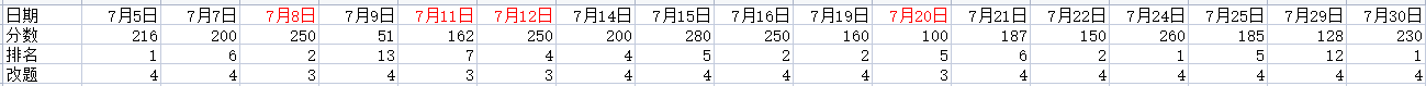 挂分还行,比去年少多了,总共挂了不超过 400,最多一回挂了 100,7 月 29 日到 8 月 15 日史蒂夫 F4 不在,所以题较为好改(虽然还是不会)。