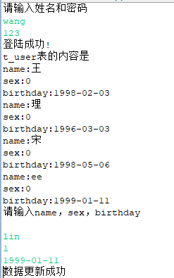 package aa; import java.sql.Connection; import java.sql.DriverManager; import java.sql.PreparedStatement; import java.sql.ResultSet; import java.sql.SQLException; import java.util.Scanner; public class Test1 { /** 在上一题基础上,当登录成功后, 将t_user表(id、name、sex、birthday)的信息进行显示 (要求使用DB.java完成登录和获取t_user表中数据的操作), 最后再对t_user表进行一条记录的添加操作。 */ public static void main(String[] args) { Scanner input=new Scanner(System.in); System.out.println("请输入姓名和密码"); String username=input.nextLine(); String password=input.nextLine(); Connection con=null; PreparedStatement pre=null; try { Class.forName("com.mysql.jdbc.Driver"); } catch (ClassNotFoundException e) { e.printStackTrace(); } try { con=DriverManager.getConnection("jdbc:mysql://localhost:3306/aa","root","1234"); pre=con.prepareStatement("select*from bb where username=? and password=?"); pre.setString(1, username); pre.setString(2, password); ResultSet res=pre.executeQuery(); if(res.next()){ System.out.print("登陆成功!\n" + "t_user表的内容是\n"); pre = con.prepareStatement("select*from user"); res = pre.executeQuery(); while (res.next()) { String name = res.getString(2); String sex = res.getString(3); String birthday = res.getString(4); System.out.println("name:" + res.getString("name")); System.out.println("sex:" + res.getString("sex")); System.out.println("birthday:" + res.getString("birthday")); } } System.out.println("请输入name,sex,birthday\n"); String name =input.nextLine(); String sex = input.nextLine(); String birthday = input.nextLine(); pre = con.prepareStatement("insert into user(name,sex,birthday) values(?,?,?)"); pre.setString(1, name); pre.setString(2, sex); pre.setString(3, birthday); int count=pre.executeUpdate(); if(count>0){ System.out.println("数据更新成功"); } else{ System.out.println("数据更新失败"); }if(res!=null){ res.close(); } } catch (SQLException e) { e.printStackTrace(); } finally{ try { pre.close(); con.close(); } catch (SQLException e) { // TODO Auto-generated catch block e.printStackTrace(); } } } }