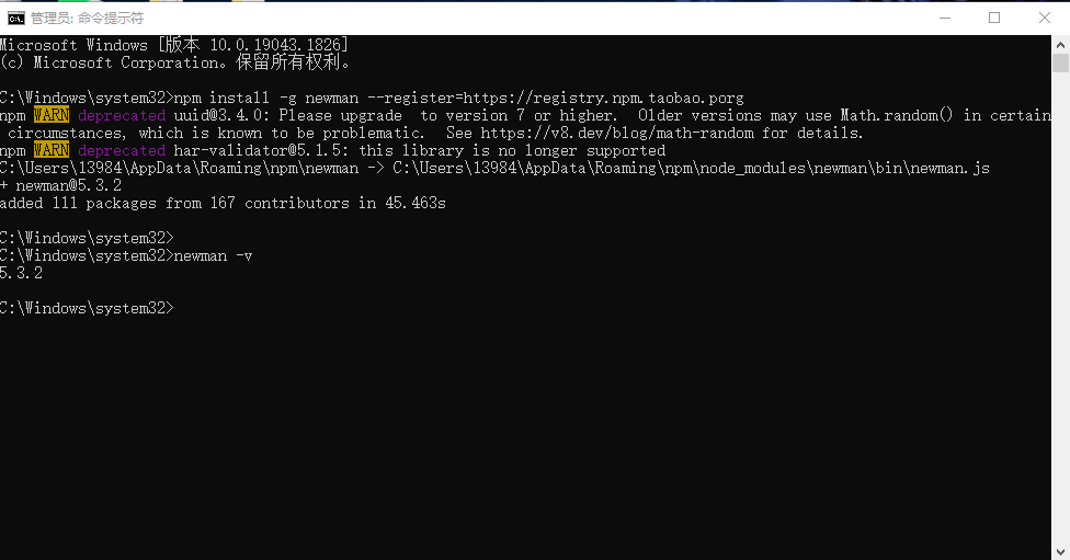 验证成功的命令为:newman -v