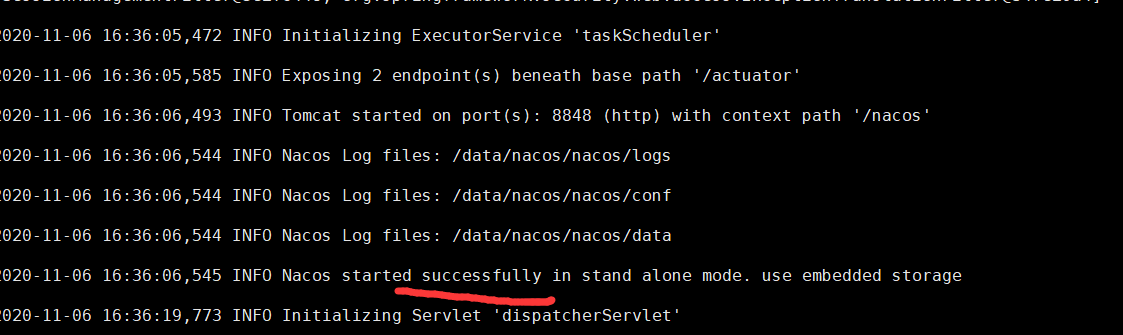 在/nacos/bin文件夹下执行命令:sh startup.sh -m standalone,后查看logs中的start.out最终出现successfully即为启动成功。