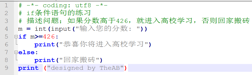 m = int(input("输入您的分数: ")) if m>=426: print("恭喜你将进入高校学习") else: print("回家搬砖") print ("designed by TheAB")