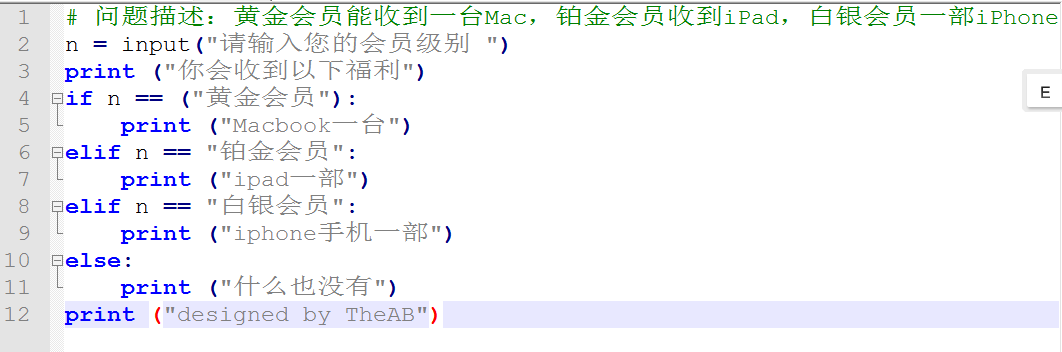 n = input("请输入您的会员级别 ") print ("你会收到以下福利") if n == ("黄金会员"): print ("Macbook一台") elif n == "铂金会员": print ("ipad一部") elif n == "白银会员": print ("iphone手机一部") else: print ("什么也没有") print ("designed by TheAB")