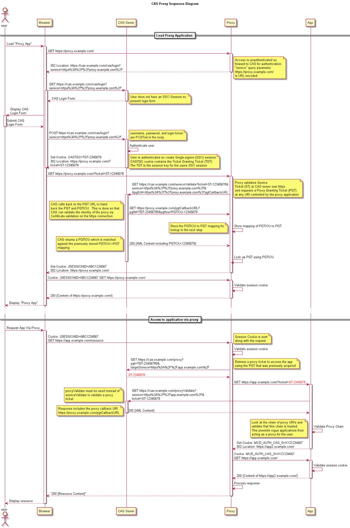 Cas Proxy可以让我们轻松的通过App1访问App2时通过Cas Server的认证,从而访问到App2。其主要原理是这样的,App1先通过Cas Server的认证,然后向Cas Server申请一个针对于App2的proxy ticket,之后在访问App2时把申请到的针对于App2的proxy ticket以参数ticket传递过去。App2的AuthenticationFilter将拦截到该请求,发现该请求携带了ticket参数后将放行交由后续的Ticket Validation Filter处理。Ticket Validation Filter将会传递该ticket到Cas Server进行认证,显然该ticket是由Cas Server针对于App2发行的,App2在申请校验时是可以校验通过的,这样我们就可以正常的访问到App2了。