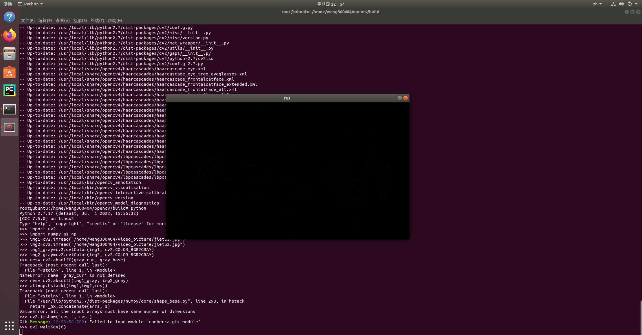 1 import cv2 #opencv的缩写为cv2 2 import matplotlib.pyplot as plt # matplotlib库用于绘图展示 3 import numpy as np # numpy数值计算工具包 4 vc = cv2.VideoCapture('、home/wang300404/opencv/test.mp4') 5 c=1 6 while open: # 如果正常打开,则不停循环读取 7 ret, frame = vc.read() 8 if frame is None: # 视频读完以后的下一帧为空 9 break 10 if ret == True: 11 gray = cv2.cvtColor(frame, cv2.COLOR_BGR2GRAY) # 读取的图片转换成黑白的 12 cv2.imwrite('/home/wang300404/video_picture'+str(c)+'.jpg') 13 c=c+1 14 if cv2.waitKey(1) & 0xFF == 27: # 把视频的每一帧保存,0xFF为退出键ESC 15 break 16 vc.release() # release()完成与 open() 相反的工作.释放 open() 向内核申请的所有资源 17 cv2.destroyAllWindows() # 销毁所有窗口 18 19 -----------------------------读取视频,并把每一帧作为照片保存------------------------ 20 21 # 读取图片 22 img1 = cv2.imread("/home/wang30040/video_picture/jietu1.jpg") 23 img2= cv2.imread("./home/wang30040/video_picture/jietu2.jpg") 24 # 转灰度图 25 img1_gray= cv2.cvtColor(img1, cv2.COLOR_BGR2GRAY) 26 img2_gray = cv2.cvtColor(img2, cv2.COLOR_BGR2GRAY) 27 28 res= cv2.absdiff(gray_cur, gray_base) 29 cv2.imshow("res ", res ) 30 cv2.waitKey(0)