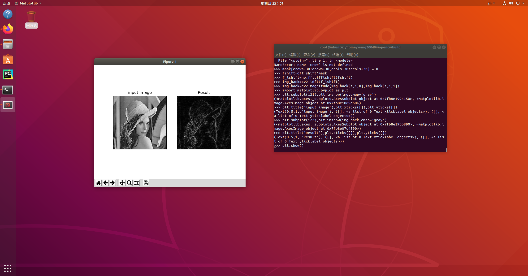 1 import numpy as np 2 import cv2 3 from matplotlib import pyplot as plt 4 5 img = cv2.imread('home/wang300404/opencvtest/le.jpg',0) 6 img_float32 = np.float32(img) 7 8 dft = cv2.dft(img_float32,flags=cv2.DFT_COMPLEX_OUTPUT) 9 dft_shift = np.fft.fftshift(dft) 10 11 rows, cols = img.shape 12 crow, ccol = int(rows/2), int(cols/2) # 中心位置 13 14 # 高通滤波 15 mask = np.ones((rows,cols,2),np.uint8) 16 mask[crow-30:crow+30,ccol-30:ccol+30] = 0 # 中间区域置 0,外面的区域置 1 17 fshift = dft_shift * mask 18 f_ishift = np.fft.ifftshift(fshift) 19 img_back = cv2.idft(f_ishift) 20 img_back = cv2.magnitude(img_back[:,:,0],img_back[:,:,1]) 21 22 plt.subplot(121),plt.imshow(img,cmap = 'gray') 23 plt.title('Input Image'), plt.xticks([]),plt.yticks([]) 24 plt.subplot(122),plt.imshow(img_back,cmap='gray') 25 plt.title('Result'),plt.xticks([]),plt.yticks([])