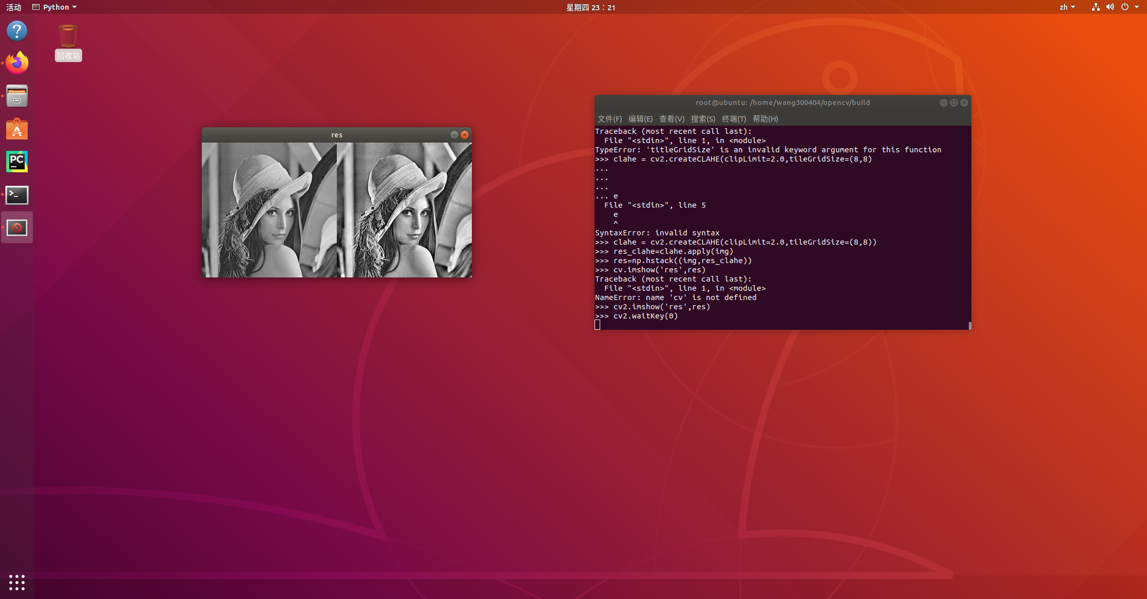 1 img=cv.imread('/home/wang300404/opencvtest/le.jpg') 2 clahe = cv2.createCLAHE(clipLimit=2.0,tileGridSize=(8,8)) # 自适应均衡化方法生成出来 3 res_clahe = clahe.apply(img) # 方法应用到输入图片当中 4 res = np.hstack((img,res_clahe)) 5 cv2.imshow('res',res) 6 cv2.waitKey(0)