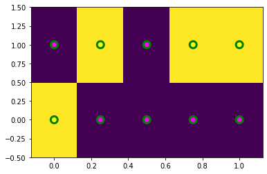 plt.scatter(xx.reshape(-1,) ,yy.reshape(-1,), marker='o', s=100, c=Z.reshape(-1,), cmap='spring', edgecolor='g', linewidth=3)