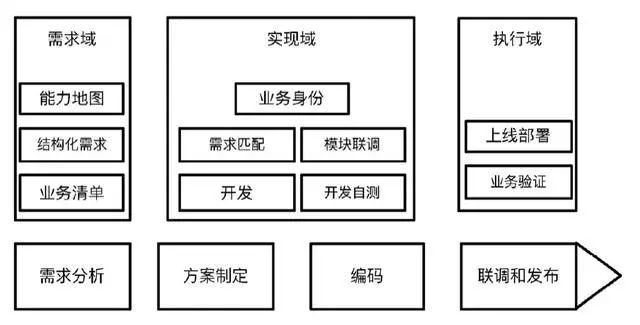 需要域主要通过需求的分析将需求结构化,形成业务清单和能力地图(本质上就是确定这个业务所需要的数据和功能组件接口)。实现域主要就是将数据和功能组件接口整合成服务该业务的实现(并给他标识一个身份),如果当前的功能集不满足的话,还需要有部分的开发工作。最后的执行域就是把这些功能代码或者配置部署到线上,让用户去实际执行。
