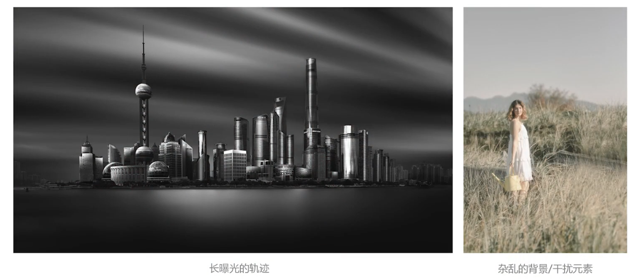长曝光轨迹(天空中流云、车流轨迹、雾化水面、星轨)、杂乱的背景/干扰元素