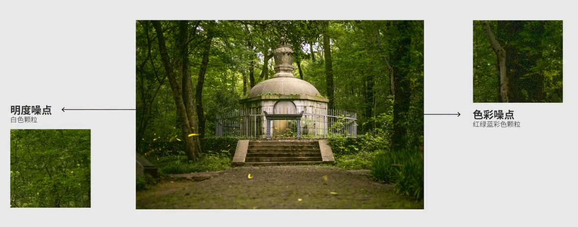 噪点是画面中一些白色或彩色颗粒,通常是因为高ISO拍摄或大幅度欠曝提升阴影导致。白色颗粒叫明度噪点、红色蓝彩色颗粒叫色彩噪点。