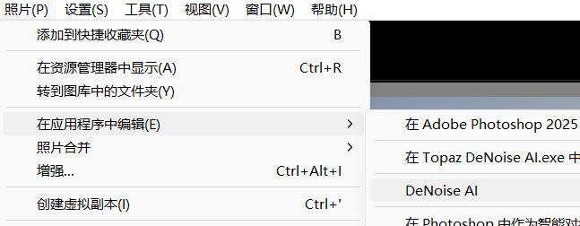 安装降噪插件,然后在首选项->外部编辑里,选择其他外部编辑器,设置DeNoise AI的路径。之后先应用降噪得到新的图片,然后在针对该图片修图。