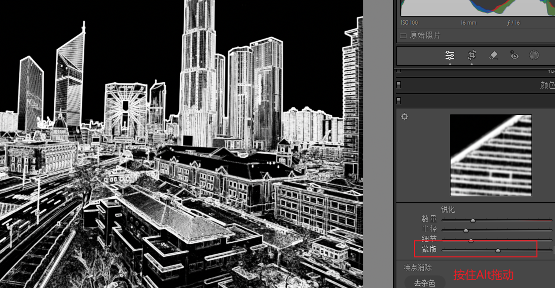 蒙版:按住Alt进入黑白模式观察锐化效果,白色是会被锐化的细节,黑色是不会被影响的细节。通常选择主题部分锐化,避免噪点被锐化变得更加明显。