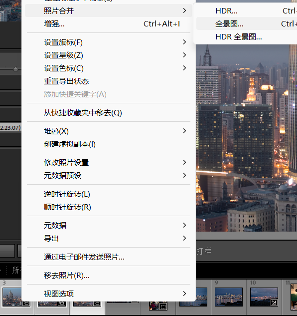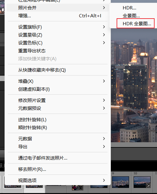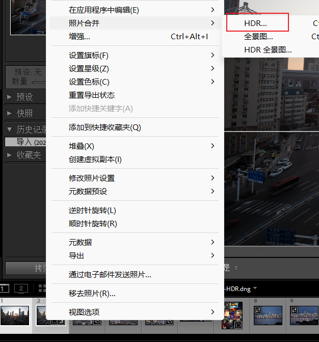选择需要包围曝光的照片,右键->照片合并->HDR,自动合成包围曝光照片