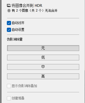 自动对齐:在合成时对齐不同曝光照片,一般勾选。拍摄时相机难免有轻微晃动,即使使用的脚架拍摄。