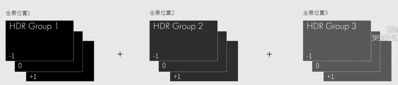 全景的每一张照片的HDR合成,包围曝光的几个档位需要相同且等距。比如下图的-1EV、0EV、1EV。