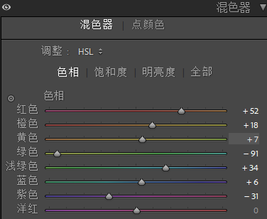 颜色杂乱:归色(HSL),调整某个色相趋向临近色相,比如红色色相右拉趋向橙色,让画面颜色更加统一、纯净、和谐
