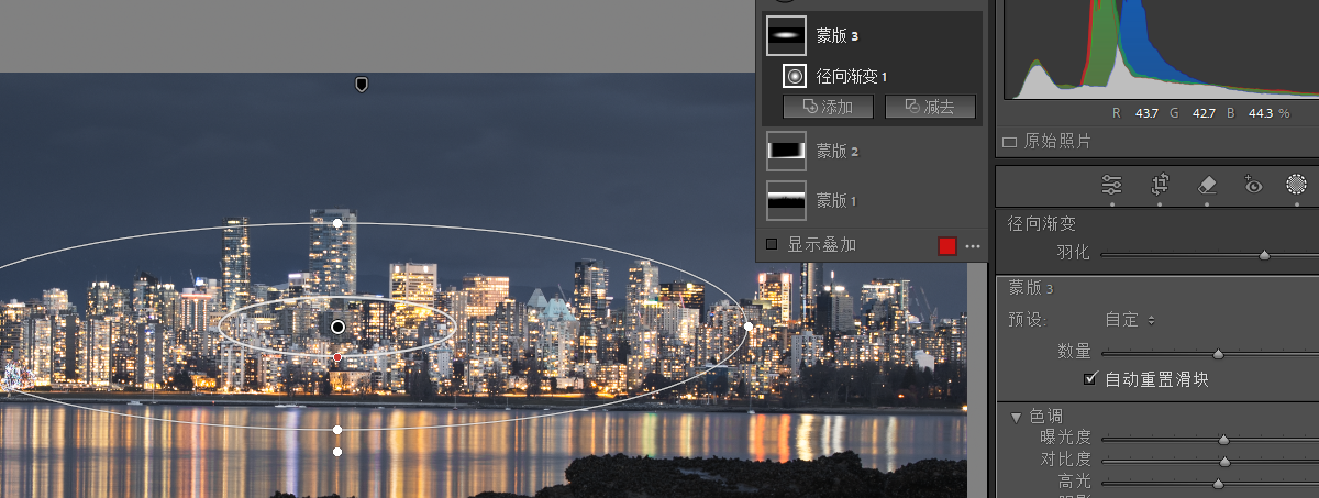 新建镜像渐变,调整曝光、纹理。然后添加新的径向渐变,应用调整,满足少量多次的处理